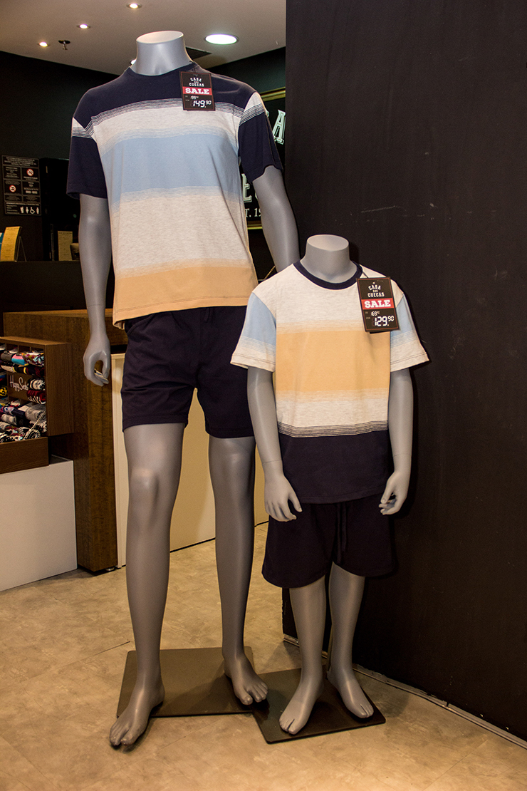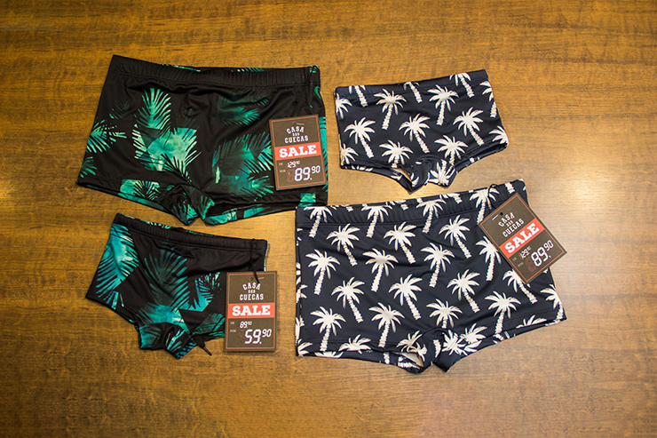 Casa das Cuecas: Pijama pai de R$ 199,90 por R$ 149,90. Pijama filho de R$ 169,90 por R$ 129,90. Sunga pai de R$ 129,90 por R$ 89,90. Sunga filho de R$ 89,90 por R$ 59,90.