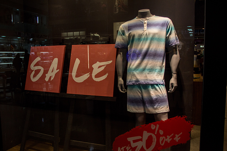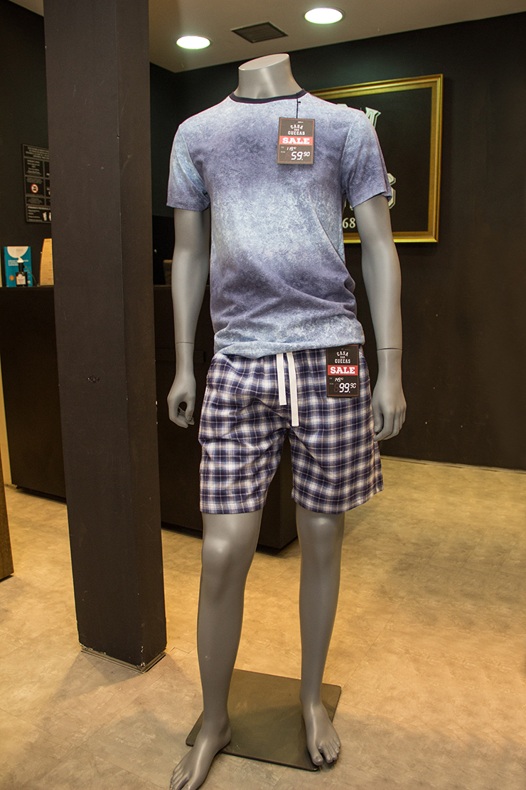 Pijama vitrine de R$ 229,90 por R$ 129,90. Camiseta azul de R$ 119,90 por R$ 59,90 e bermuda xadrez de R$ 149,90 por R$ 99,90.