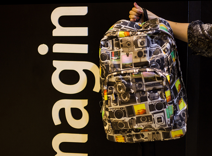 Imaginarium: Mochila cinza bolinhas de R$ 229,90 por R$ 159,90. Mochila fotografia R$ 199,90 por R$ 119,90. Bolsa a tiracolo P&B de R$ 199,90 por R$ 129,90.