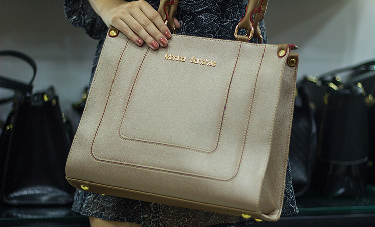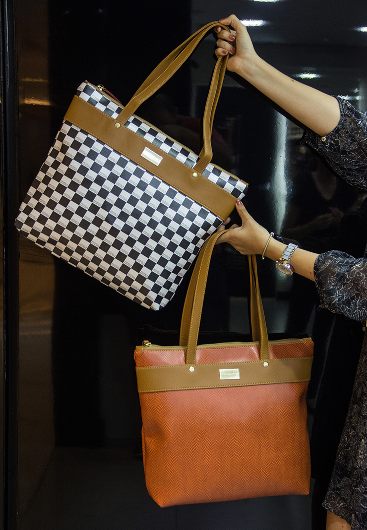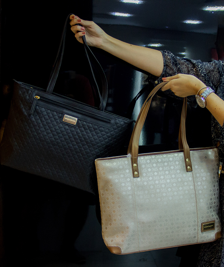 Mônica Sanches: Bolsas Preta e Nuda MS por R$ 129,90 (cada). Bolsas Telha e “Preta & Branca quadriculada” por R$ 99,90 (cada). Bolsa listrada Navy Azul e Branco por R$ 199,90. Bolsa metalizada bronze por R$ 199,90.