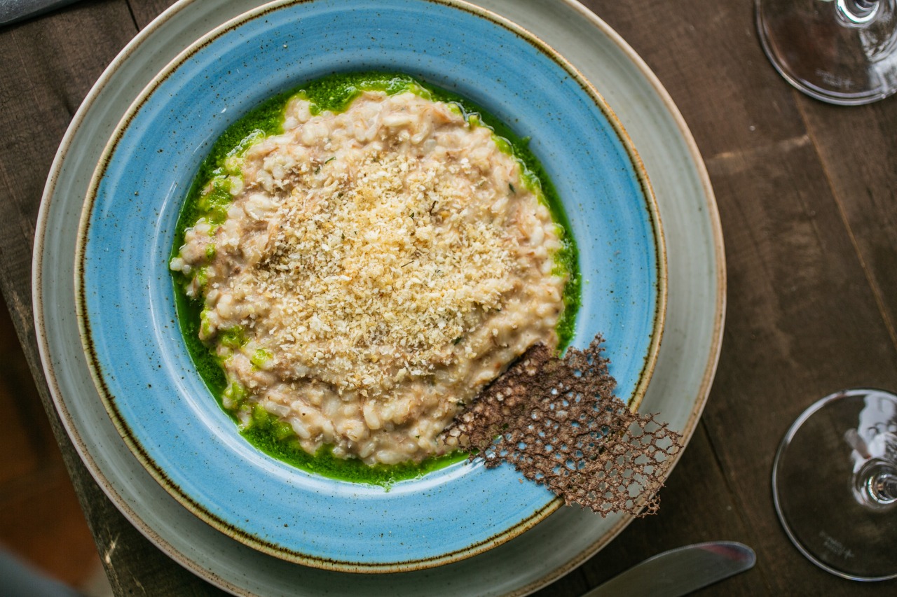Risoto Ragout: risoto de ragout, pesto de agrião e farofa panko.