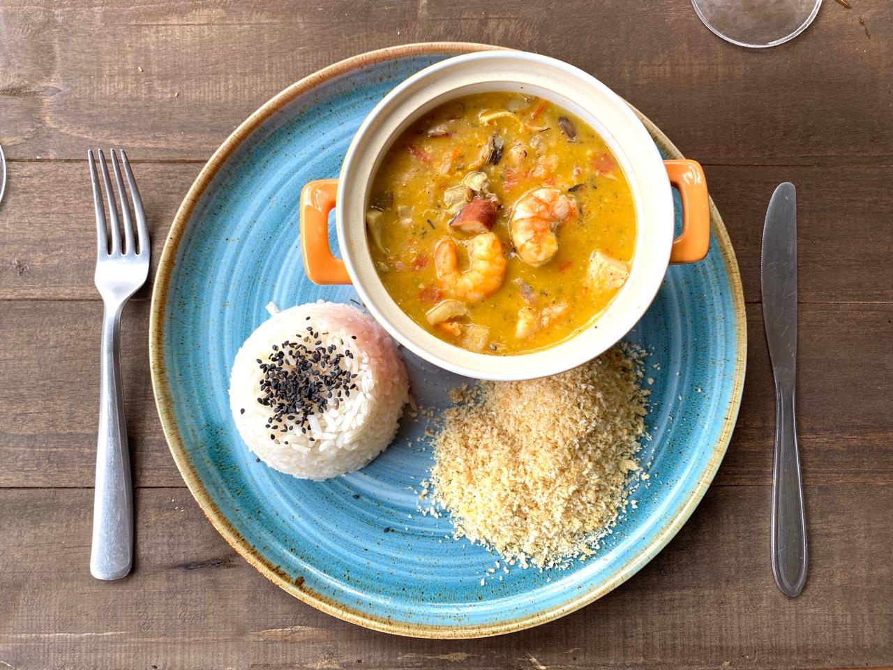 Cassoulet al Mare: cassoulet de frutos do mar com arroz branco e farofinha da casa.