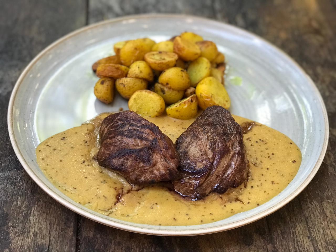 Filé 3 Mostardas R$55 – Filé Mignon ao molho de três mostardas com batatas assadas com alho confit e alecrim.