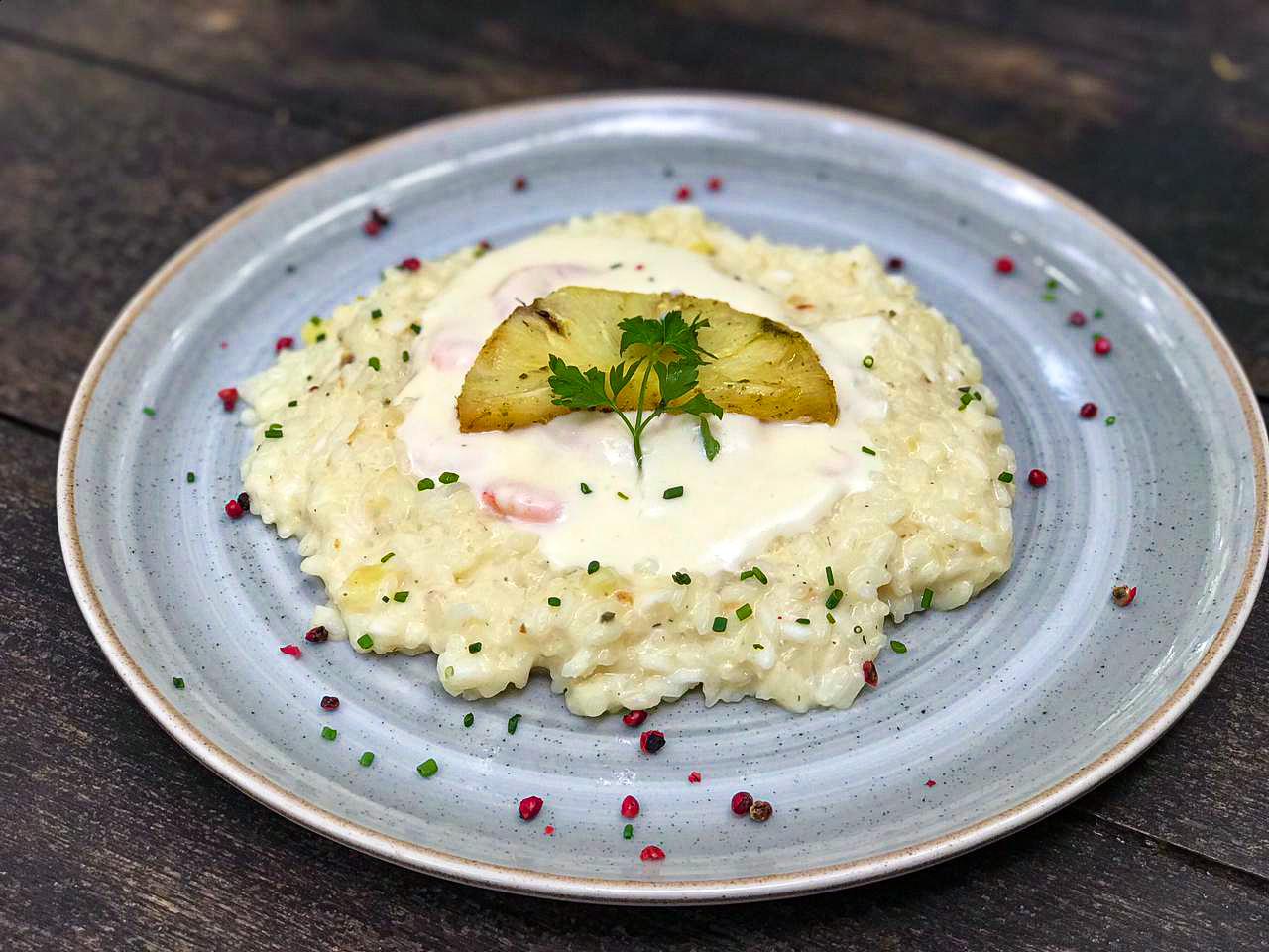 Gamberi Brie: camarão ao molho de brie, risoto de abacaxi e pimenta vermelha.