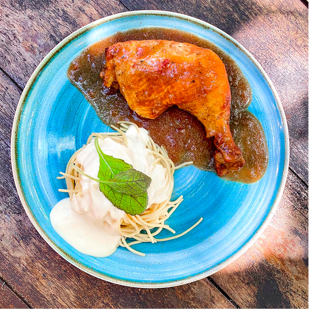 Coq au Vin: coxa de frango ao molho de vinho com espaguete quatro queijos.