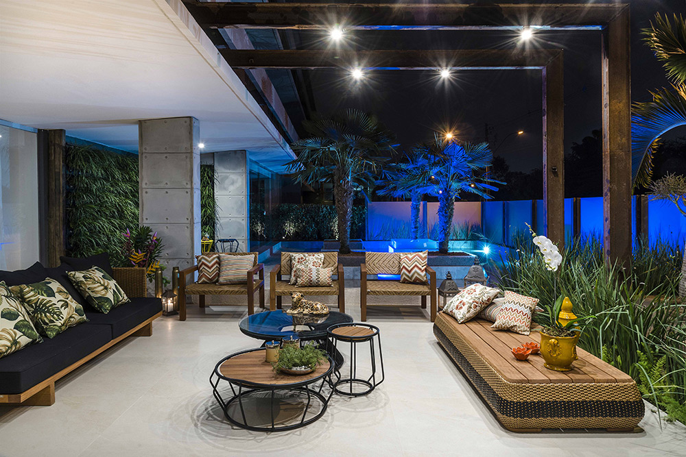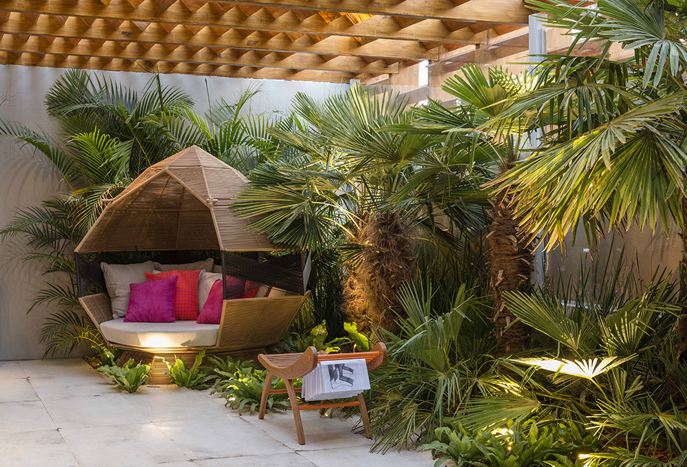 - Varanda Kashmir – Valéria Leão e Marina Pimentel. Cada detalhe é pensado para valorizar momentos de celebração, entretenimento e convivência. O cenário é abraçado pelo verde tropical de espécies como Palmeira, Areca, Asplenio e Colimeia, que casam com vasos de cerâmica e a madeira no pergolado.
