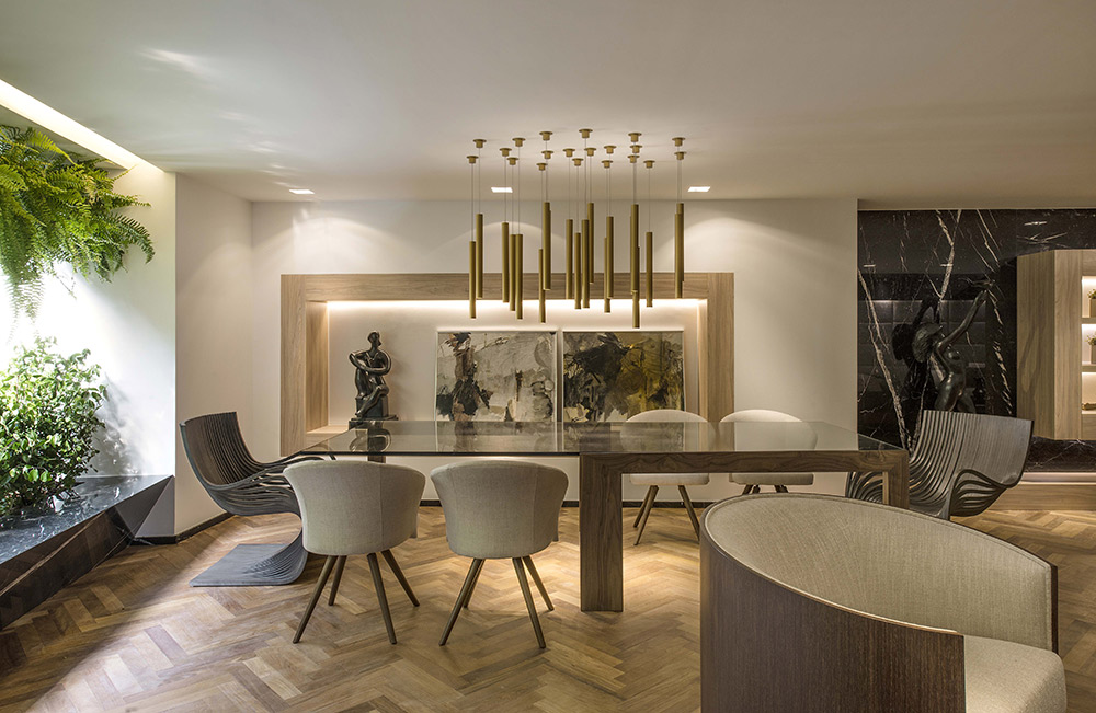 - Lounge – Walléria Teixeira. A sala de jantar integrada estende os encontros de negócios. A estante de linhas elegantes ganha leveza ao intercalar a madeira com faixas de espelhos. A mesa Legg e as quatro cadeiras Clad são de Jader Almeida. Já a cadeira Beg, estofada em couro caramelo, é de autoria de Sérgio Rodrigues.