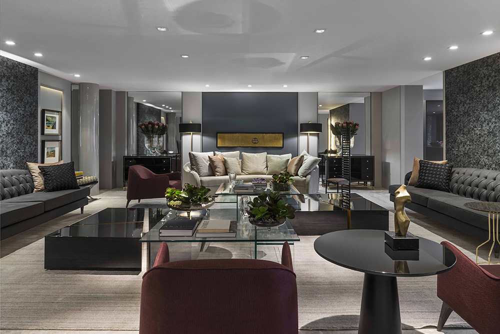 - Lounge – Walléria Teixeira. O espaço com 100m² foi dividido em três ambientes, funcionando como living e estar corporativo para eventos informais. Aqui, o teto foi liberado dos pontos de luz em favor de um visual limpo, o que ainda valoriza o contraste com o papel de parede Nuvolette do artista italiano Piero Fornasetti. Também é possível ver parte da poltrona Moleca, de Sergio Rodrigues.