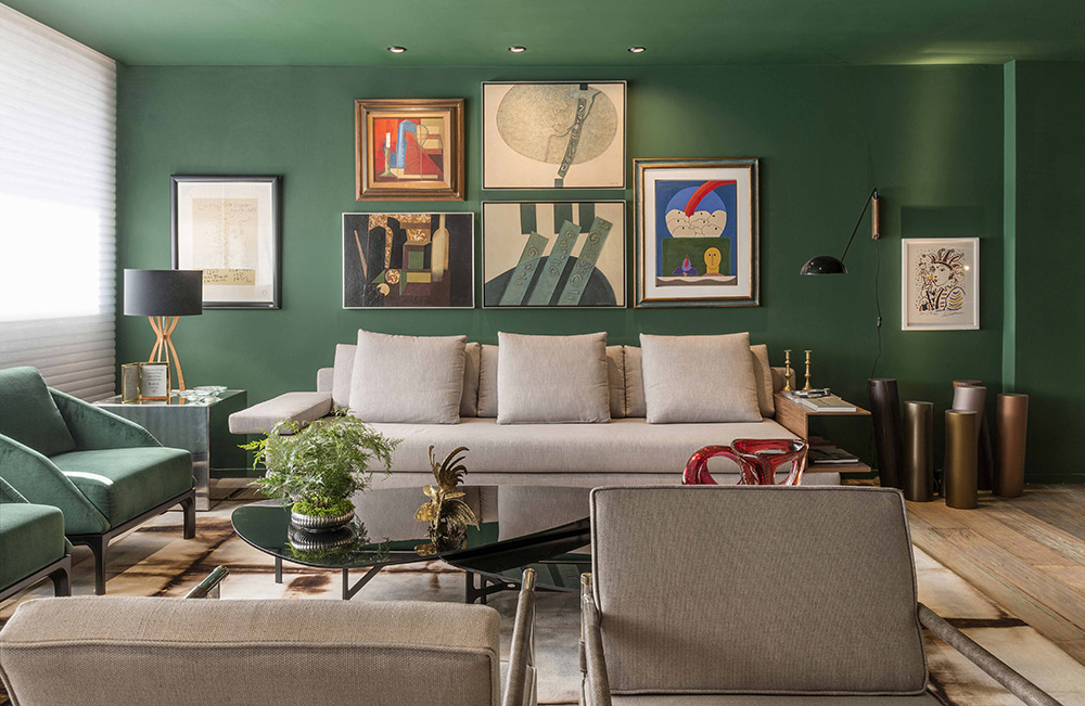 - Sala de Música – Clarissa Braga, Manuella Leite e Cristhiane Rauppp (Esquina Arquitetura). Estes 78m² respiram natureza, com o uso da cor verde e revestimentos rústicos. Entre eles, uma parede de tijolinhos, outra em pedra natural e o piso vinílico com aparência de madeira. A arte está em cada detalhe, seja na icônica luminária central ou na escultura de Paulo de Paula. O mobiliário convoca linhas simples e despojadas, como as poltronas de Fabricio Roncca.