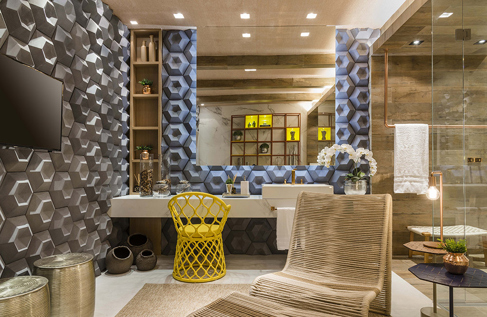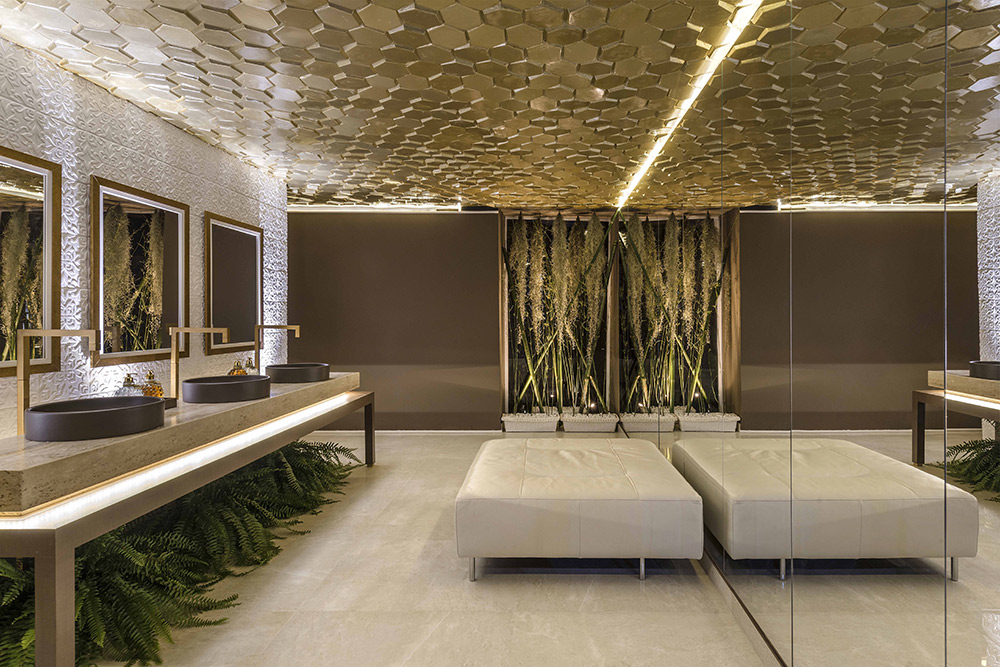 - Lavabo Gold – Wesley Monteiro e Luisa Costa (LW Engenharia e Design). Inspirado no Restaurante Gold, em Milão, o espaço investe nas formas geométricas em 3D. No teto, entram em cena placas de gesso em formato hexagonal pintadas em dourado. Uma das paredes foi revestida com porcelanato HD que lembra uma renda – ela é refletida no espelho do lado oposto, que duplica visualmente o ambiente de 20m².