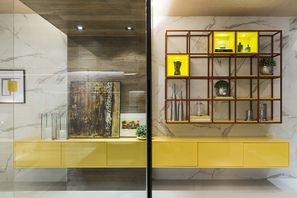 - Banho de Luxo – Gustavo Assunção, Laura Oliveira e Sergio Peres (Simmetria Arquitetura). A aparência de madeira aquece a área do box, em porcelanato. O amarelo pontua o espaço de várias formas, seja no mobiliário fixo ou nos nichos iluminados. Para garantir a sofisticação, uma das paredes foi revestida em mármore.