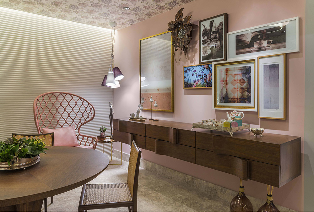 - Sala de Chá – Caroline Napoleão e Fernando Rodrigues. A tradição do chá das cinco e a cor do ano, o rosa, foram algumas inspirações. Com apenas 17m², a sala recupera a história do chá a partir de peças originais inglesas, cuja delicadeza é referenciada no papel de parede floral aplicado no teto. Outro diálogo bem-vindo acontece entre a poltrona Painho, de Marcelo Rosenbaum, e o aparador Ondas, de Arthur Casas.