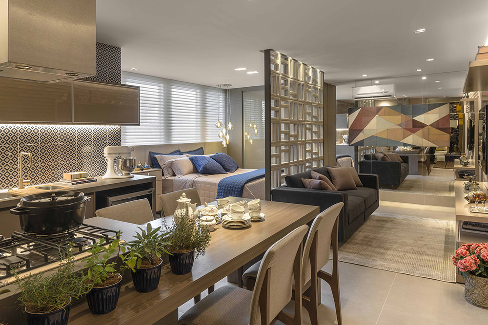 - Com Açúcar, Com Afeto – Marcelo Marcolino e Desirée Nassaralla. Memórias afetivas, como almoços em família, são celebradas pela dupla. Ela aposta em peças e móveis de madeira maciça ao mesmo tempo em que utiliza pendentes moderninhos acima da mesa de refeições. Um mosaico em madeira natural filetado de forma artesanal, em formato de espinha de peixe, renova a parede. Já os cobogós em concreto na cor branca formam uma divisória no ambiente de 60m².
