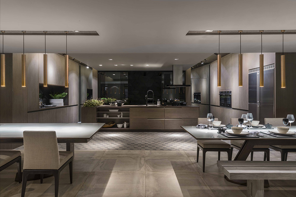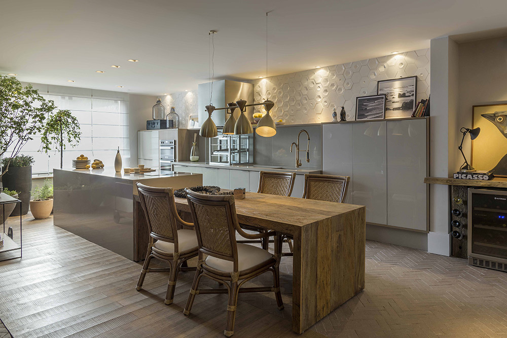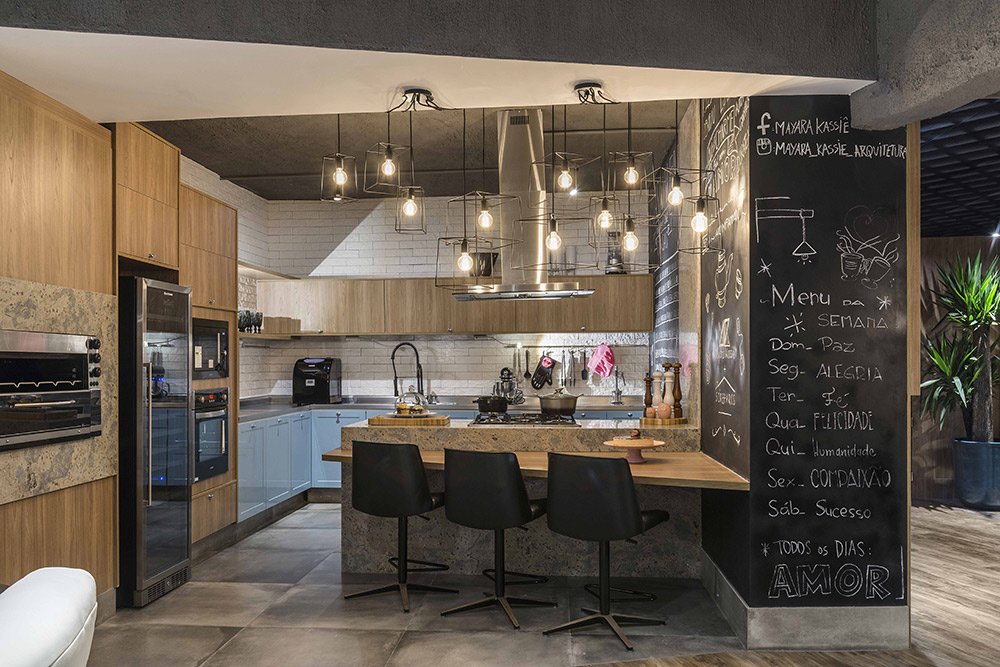 - Espaço de Convivência – Mayara Kassiê. O espaço foi idealizado para relaxar, celebrar com amigos e preparar pratos na cozinha de um chef português. A madeira e os tijolinhos tornam o ambiente caloroso, assim como o conjunto de pendentes que complementa a luz natural e dá todo o destaque à área de cocção.