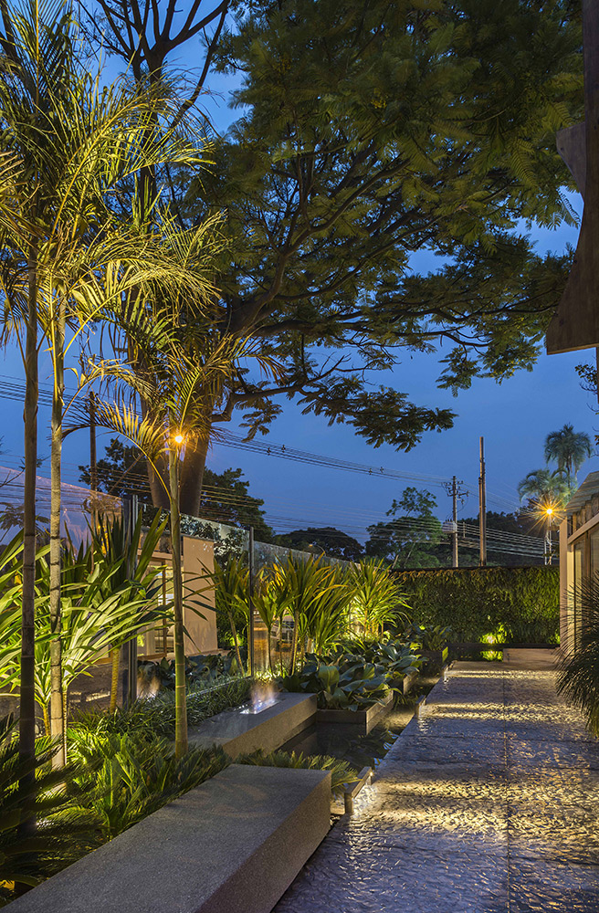- Praça Jardim – Cleber Depiere e Gabriel Domingues. A dupla desenhou estruturas verticais metálicas, como grandes totens verdes, que variam nos formatos e texturas. Do teto, minam fontes de água que se derramam em antigos vasos vietnamitas. Já a lareira brota do tronco imerso no espelho d’água. A fusão destes elementos, somados à vegetação, aos seixos de diversos tamanhos e aos pontos de luz, enche de vida o ambiente de 350m².
