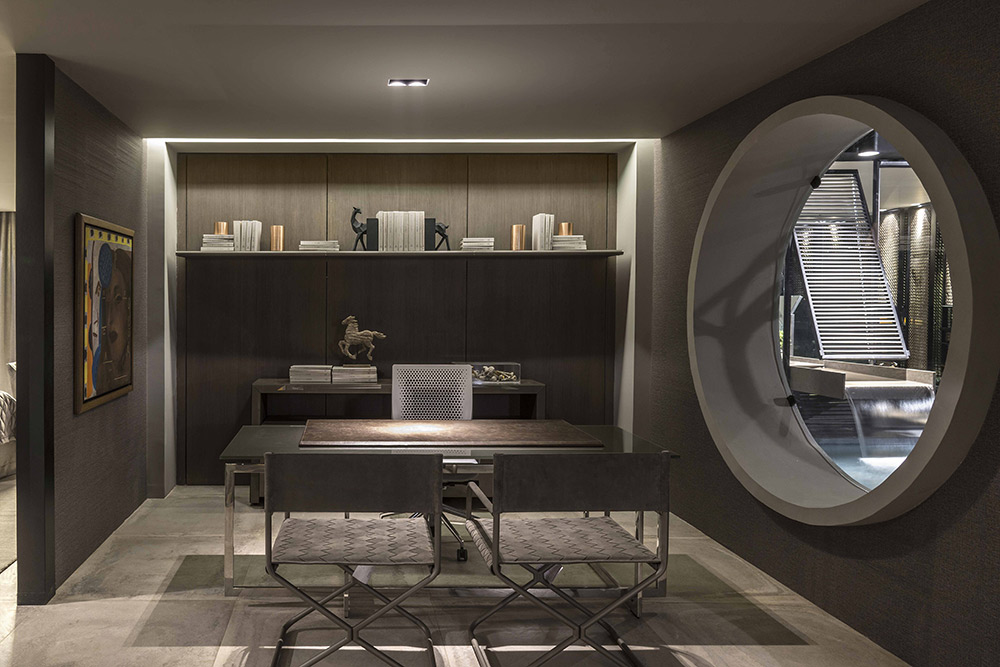 - Club Experience – Denise Zuba e Juliana Zuba (Studio Denise Zuba). A madeira se impõe para criar um office sóbrio, intimista e sem excessos, integrado à suíte. O toque moderno fica por conta de detalhes e acabamentos metalizados, além da grande abertura que permite a entrada de luz e a visão da piscina com cascata.