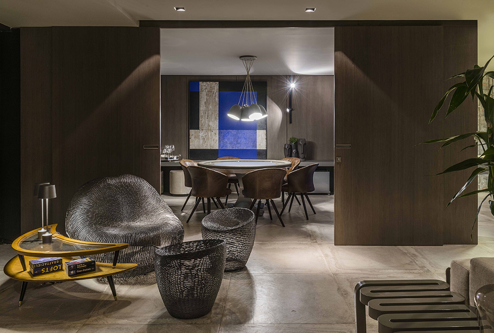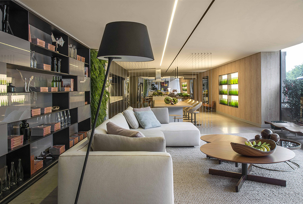 - PS SPOT – Flávia Nars e Laísa Carpaneda (Carpaneda Nars). Ideal para receber amigos em jantares e degustações de vinho, o ambiente de 135m² integra hall, sala de estar, cozinha e sala de jantar. A planta é livre, delimitada pelas tramas de cabos de aço. Algumas paredes foram aquecidas com textura de madeira ou pela grande estante laqueada. O mobiliário é assinado por designers brasileiros como Ricardo Fasanello, Jorge Zalszupin e Dado Castello Branco.