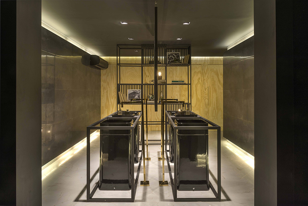 - Lavabo Público – Ana Luiza Veloso e Amanda Saback (Traama Arquitetura). A limpeza das formas geométricas destaca os bons materiais, como a madeira pinus das estantes, o piso em porcelanato marmorizado paginado em espinha de peixe e os metais com acabamento gold. O toque do metal também surge nas molduras que envolvem as cubas.