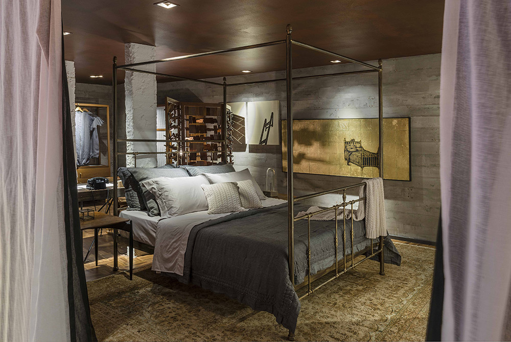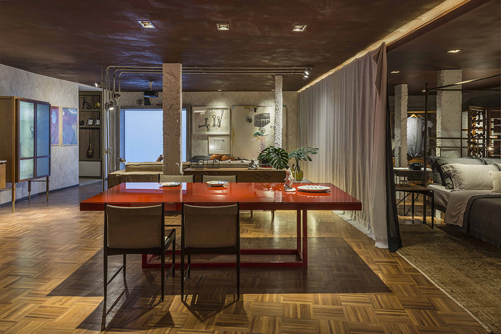 - Morada Sáinz – Eduardo Sáinz e Lilian Glayna Sáinz (Escritório Boutique 1:1 arquitetura: design). O próprio lar dos profissionais forneceu as chaves para o projeto de 118m². Ambientes abertos mesclam tons de cimento e revelam obras de arte, como em uma galeria. Na suíte e em outros espaços foi aplicado um papel de parede com efeito de concreto. A cama com dossel reforça o apelo industrial e a tendência dos metalizados.