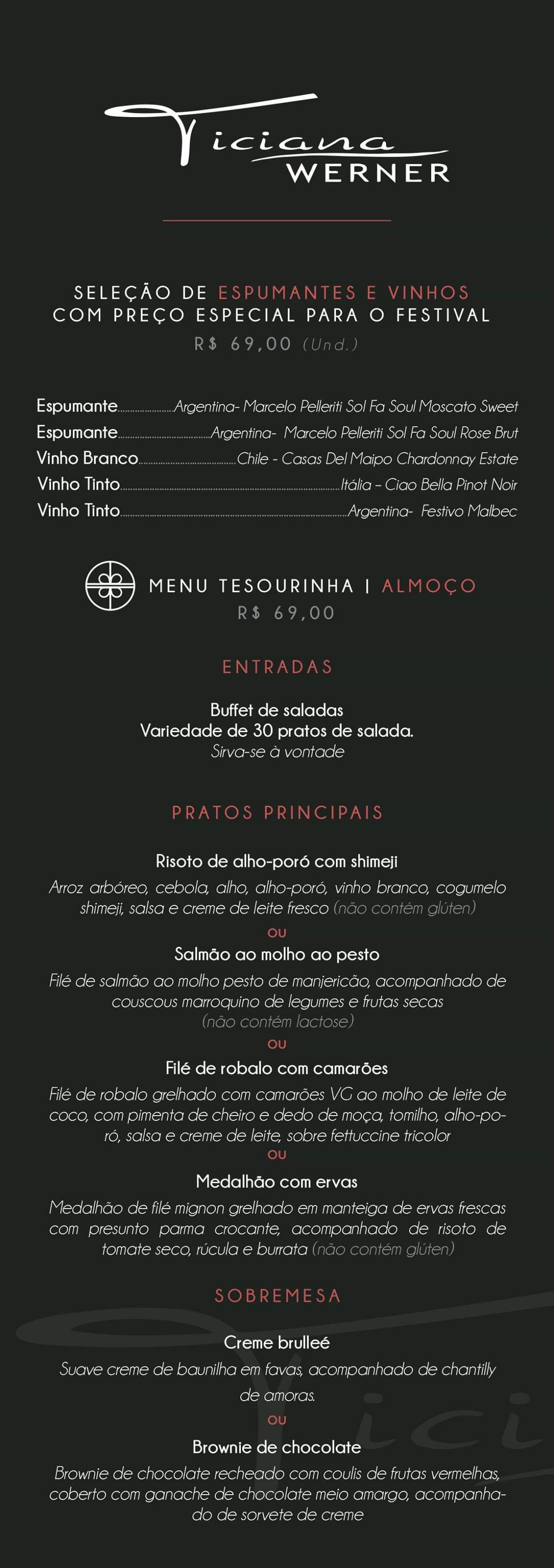 Eu amei o cardápio servido no Ticiana Werner. Além da entrada, com um buffet de antepastos e frios à vontade, os clientes poderão escolher dentre 4 opções de principais e 2 de sobremesa! Vou deixar para vocês aqui o menu completo da casa! Todas as etapas pelo valor de R$ 69,00! Estava tudo delicioso e muito bem servido!