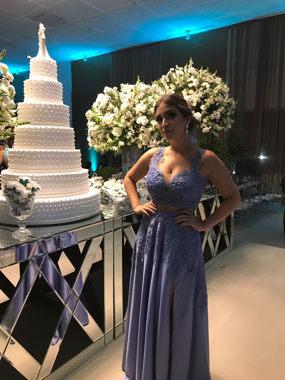 Para a ocasião especial, escolhi um vestido Vivian Spier, na cor lavanda, com uma transparência na barriga, assemelhando-se a um cropped. Amei a minha escolha! As fotos não conseguem retratar o brilho deste bordado.